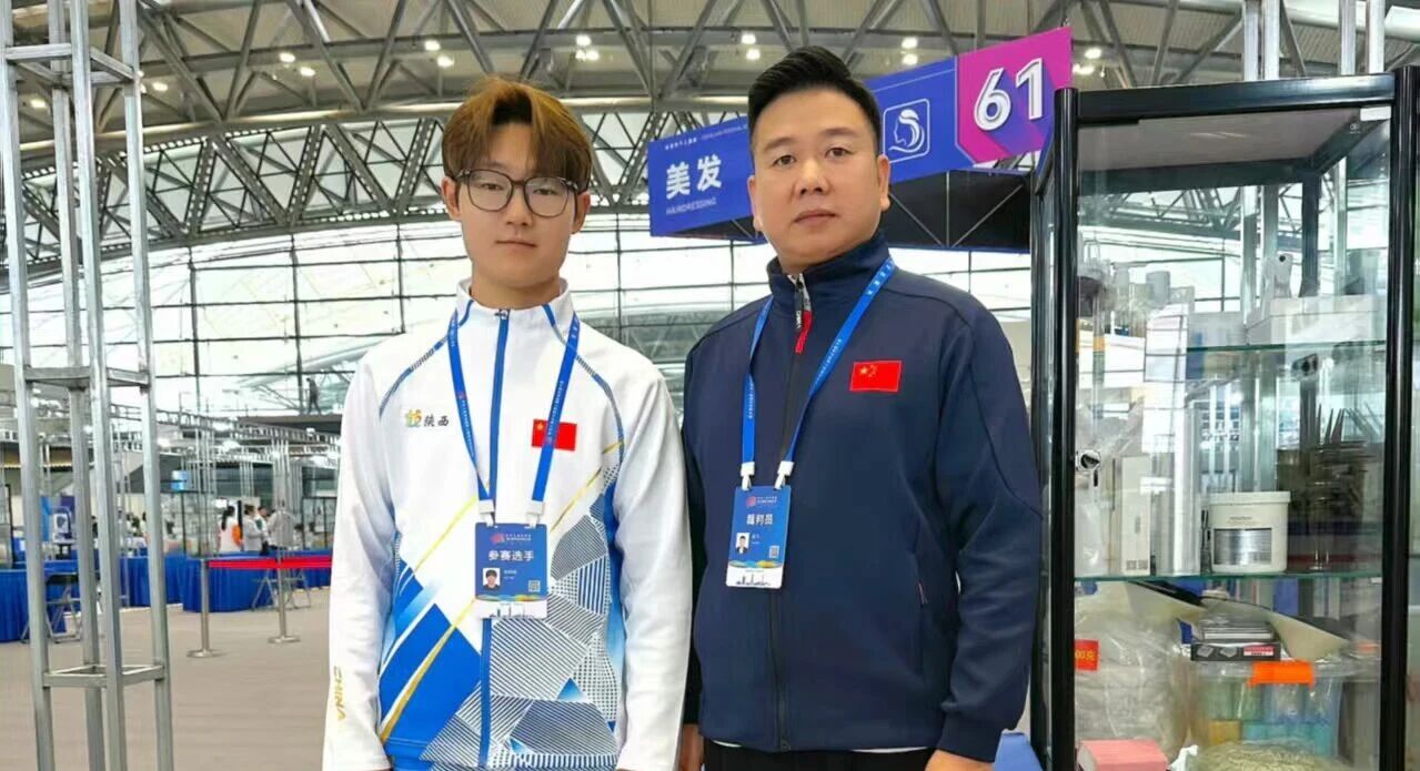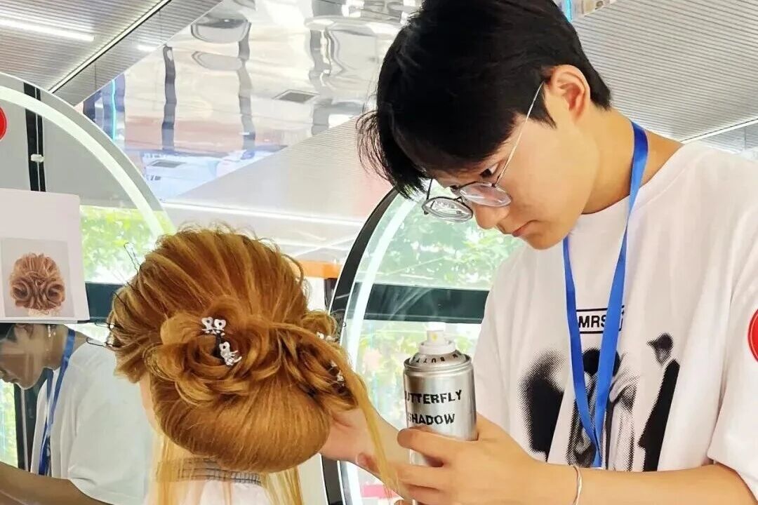这份叮嘱,被指导教师彭飞化作了日复一日的陪伴。备赛的几个月里,彭老师的训练室总是最晚熄灯:从发型设计理念的反复打磨,到实操中剪刀的角度、发片的厚度,哪怕是一个细微的手势,他都要和张成成反复示范、逐一纠正。“成成有股不服输的劲儿,我能做的,就是帮他把每一个细节练到‘刻在骨子里’。”彭老师的话里,满是对弟子的期许与骄傲——正是这份“抠细节”的耐心,为张成成的赛场发挥筑牢了根基。
