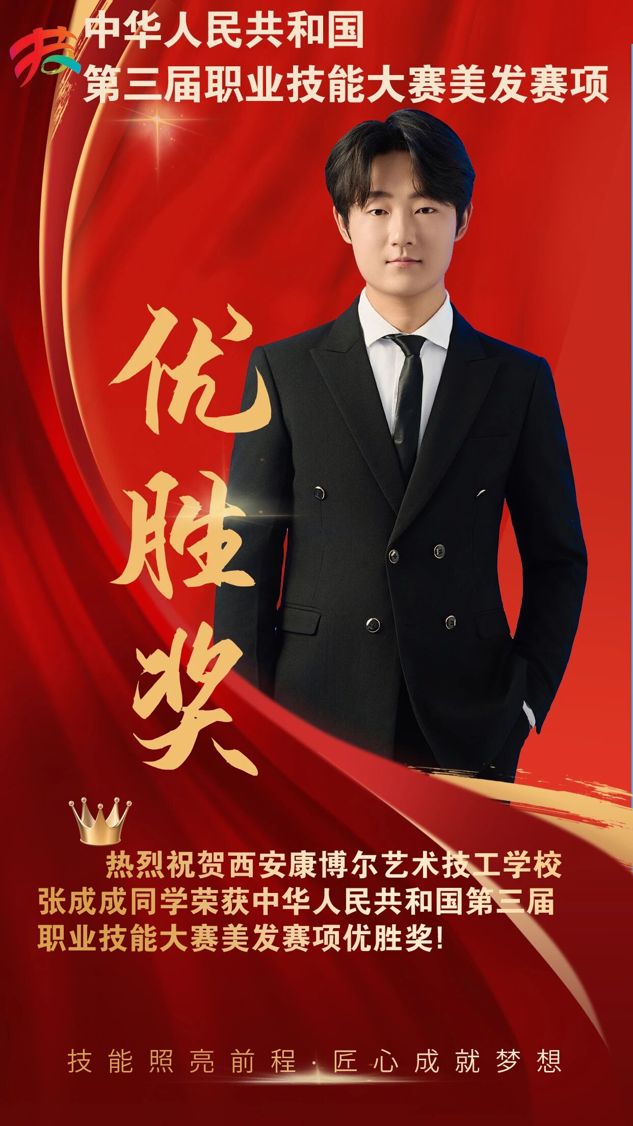 张成成同学,热烈祝贺你在第三届职业技能大赛美发赛项中斩获优胜!3天7个模块的角逐,是你用专注打磨技能、以匠心沉淀热爱的见证。